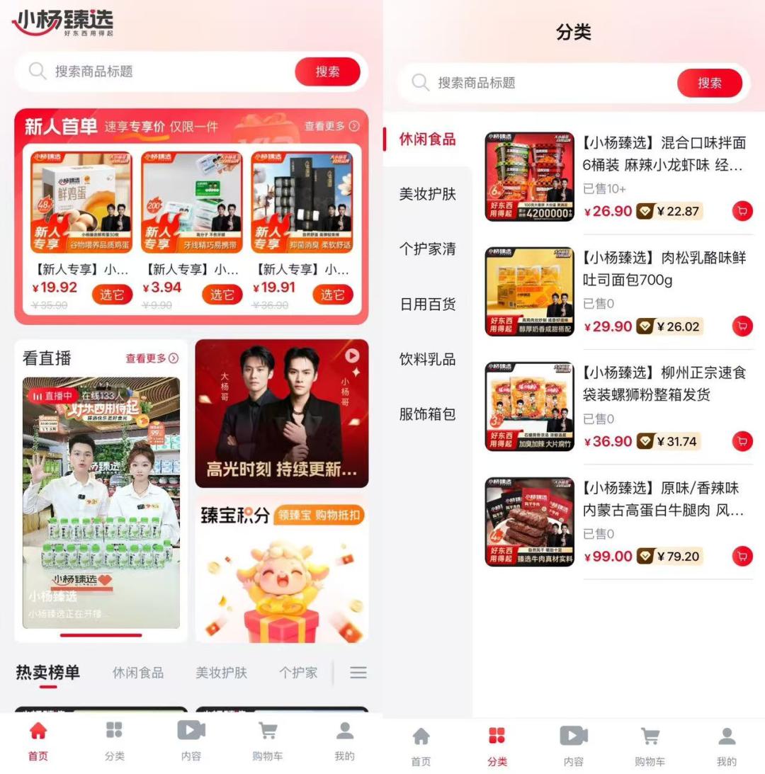开启“小杨臻选”App,可以发现内容非常丰富,包括直播间,还有大杨哥和小杨哥的一系列短视频。销售产品的类别主要包括:休闲零食、美容护肤、个人护理清洁、日用品、饮料、乳制品、服装包等。,相当于运输了其他平台大小杨哥的内容和相关电商功能。