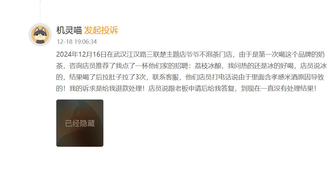 在第三方黑猫投诉平台上,有130多条投诉信息搜索爷爷不泡茶。其投诉主要集中在服务态度差、奶品质量问题、饮料异物等方面。