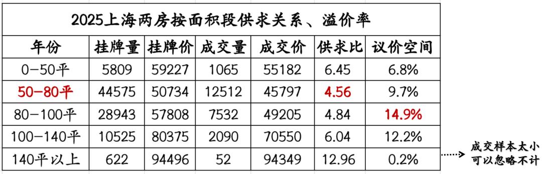对这些不同的两室产品而言,供需关系和议价率是这样的:当然,最受欢迎的是50-80㎡紧凑型两居室,供需比最低,议价率不高。