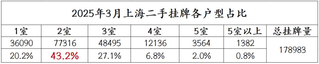 今年三月上海二手挂牌,房型占比分布特点,两室超过40%,高于其它所有房型。