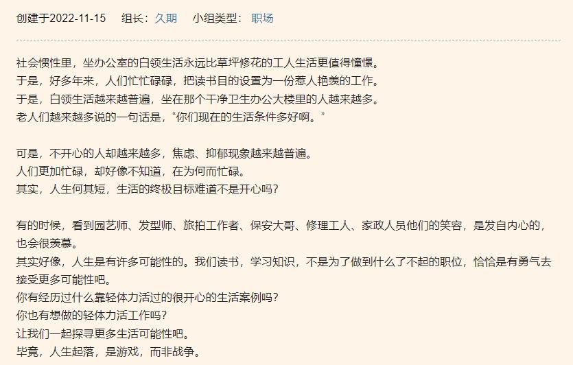豆瓣上有一个群体,聚集了近10万人——“轻体力探索联盟”。他的介绍词写道:“在社会惯性中,坐在办公室里的白领生活总是比在草地上修花的工人生活更值得期待...然而,越来越多的人不开心,焦虑和抑郁越来越普遍...有时候,看到园丁、理发师、旅行摄影师、保安兄弟、维修工人和家政工人的笑容是发自内心的。还会非常羡慕…人生有许多可能性。学习,学习知识,不是为了做一些伟大的工作,而是为了有勇气去接受更多的可能性。读书,学习知识,不是为了做什么伟大的工作,而是为了有勇气去接受更多的可能。”