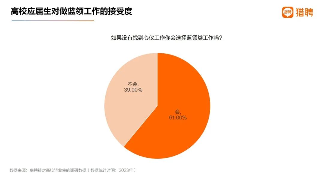 猎聘2023年对当初应届毕业生的调查显示,当被问及是否找不到自己喜欢的工作时,会选择蓝领类工作,61%的应届毕业生选择会。