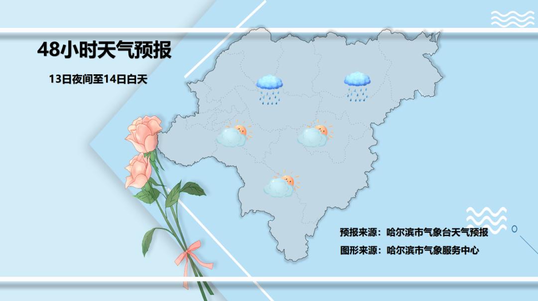 13日晚至14日白天:黑河东部、伊春、大庆、绥化、哈尔滨、鹤岗、佳木斯、双鸭山、七台河、鸡西、牡丹江南部阴天有小雨或雨夹雪,其他地区有时晴天多云。