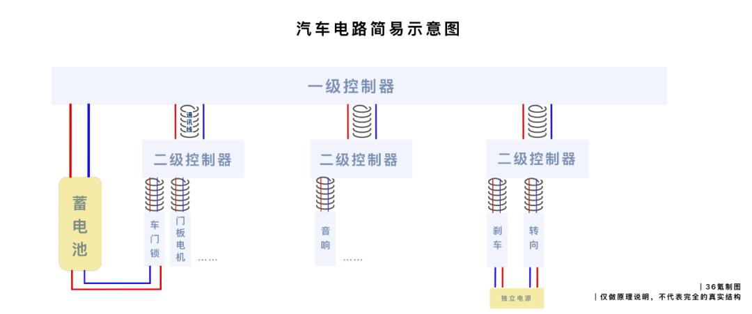 这是一个近似心脏与全身血管的结构。蓄电池是心脏,车辆主控制器与电源之间,由俗称“硬线”的正负极电线连接。
