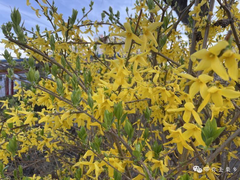 走进村子,首先映入眼帘的是一簇簇金色的连翘花。它们在树枝上温暖地绽放,细长的树枝上覆盖着小巧玲珑的花瓣,就像一串串金色的风铃,在微风中摇曳,奏响着春天的乐章。