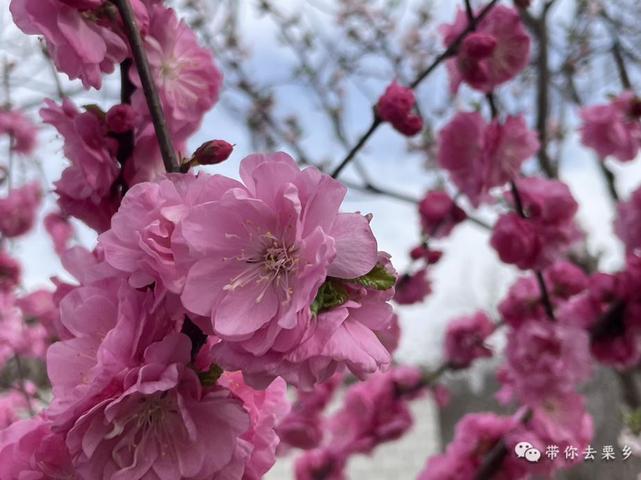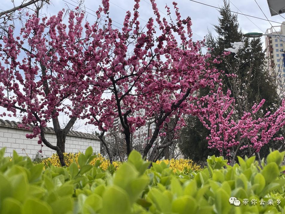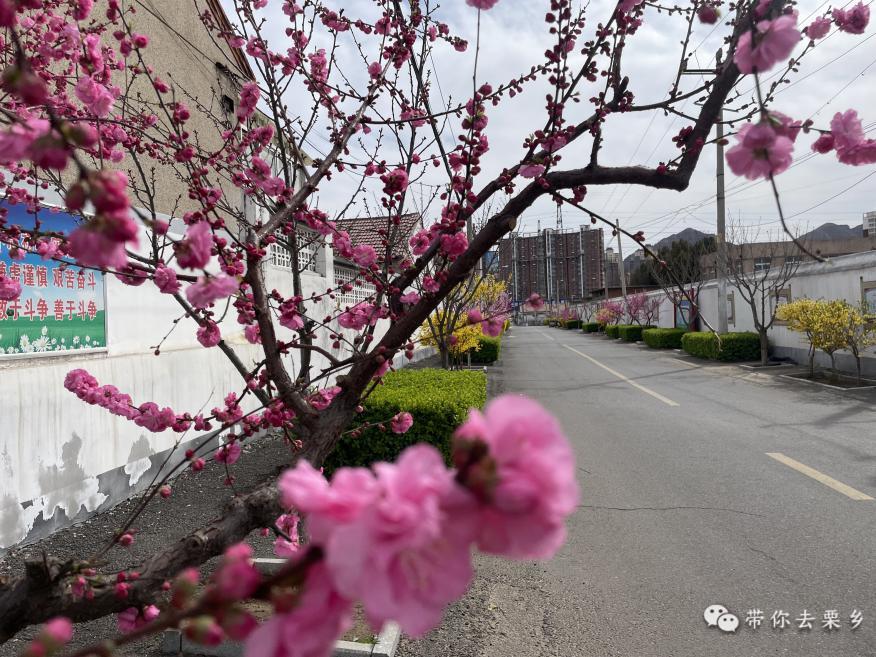 沿着整齐的街道走,可以看见一片粉嫩娇嫩的榆叶梅,满枝的花朵,或肆意绽放,或含苞待放。