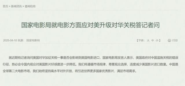 最近,鉴于美国国家对中国不合理的关税政策,国家电影局表示,为了遵循市场规律,尊重观众的选择,将适当减少美国电影的进口。这个消息一出来,很快就引起了网友的热烈讨论,并立即登上了头条热搜。