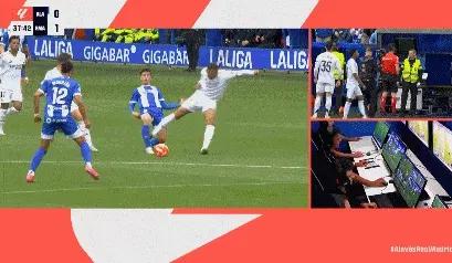 前半场第 19 分钟。进入劳尔阿森西奥 1 球,但是因为吕迪格撞门将在前面,进球被判无效。而在第 34 在几分钟内,巴尔韦德插上了助攻,卡马文加世界波兜射击打破了僵局。然而仅仅 4 几分钟后,姆巴佩被红牌罚下。那时阿拉维斯中后卫阿布卡尔拿球,姆巴佩冲过来,用力蹬在前者的右腿上。裁判正在观看 var 录像回放后直接出示红牌。