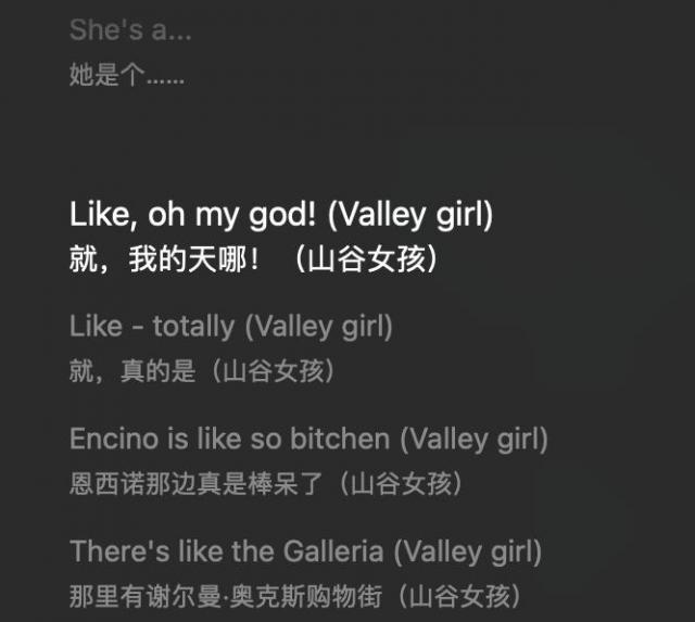 这时,尽管 like 已初见荧屏,但并非多么引人注目的语言热潮,直至 20 2000年后,美国西部加州的费尔南多峡谷涌现出一大批富裕的中产阶级金发白人年轻女孩。由于她们醒目的行为和语言特征,她们获得了一个略显偏见的昵称:Valley Girl.