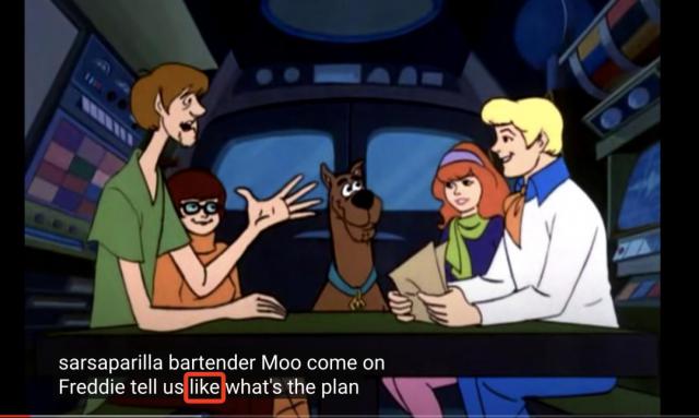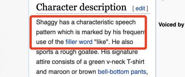 其中有一个重要角色(图中绿衣),Shaggy Rogers,说话的时候很频繁 like 在句子中使用无意义的口语插入,也成为这个角色最具象征意义的特征——这应该得益于编剧的基本功。