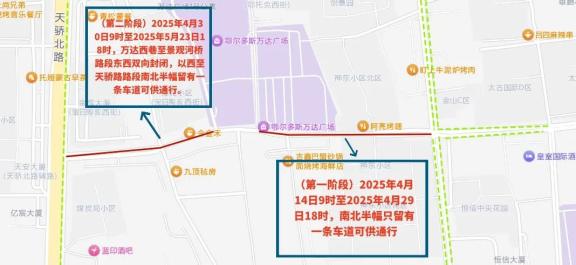二是封闭施工时间:(第一阶段)2025年4月14日9时至2025年4月29日18时;(第二阶段)2025年4月30日9时至2025年5月23日18时,如果受到不可抗拒因素的影响,工期也会相应延长。