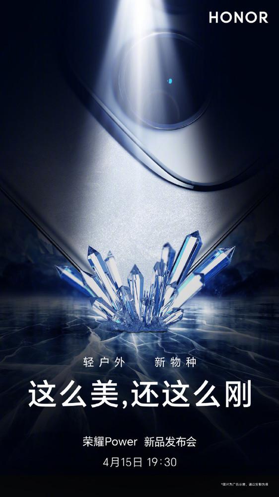 4 月 15 日晚间 19 点 30 分,荣耀将举办荣耀 Power 新产品发布会。根据官方介绍,荣耀 Power 它是一款“轻型户外手机”。在选择大尺寸设计的同时,机身将继续保持完美轻薄,内置超大容量电池,疑似支持卫星通信技术。此外,荣耀 Power 机身设计似乎是抵抗坠落性能的重点提升。