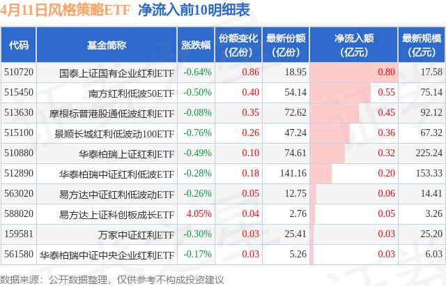 当天有 14 只风格策略 ETF 资金净流入出现,其中国泰上证国有企业净流入排名第一。 ETF(510720),份额增加 8600.0 万份,净流入额为 7979.6 万元。