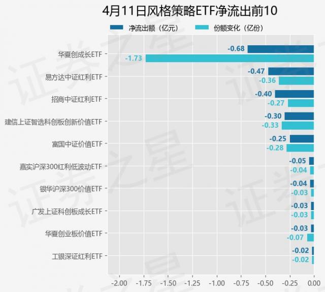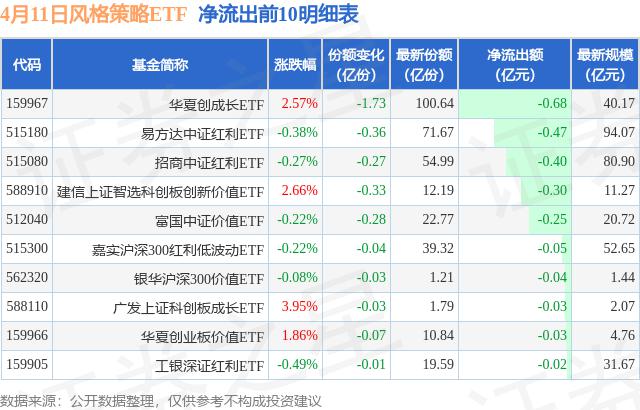 当天有 17 只风格策略 ETF 资金净流出出现在基金中,其中净流出排名第一的是华夏创增长 ETF(159967),份额下降 1.73 一亿份,净流出额为 6843.08 万元。