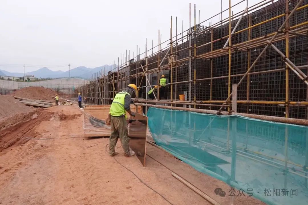 在固体废物资源的回收和基础设施项目的施工现场,机械轰鸣,工人们忙着砌墙基础墙,在各自的施工现场绑扎钢筋。