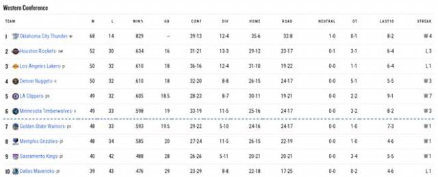西部前两名的雷霆需要根据西部附加赛的结果决定与火箭季后赛的第一轮对手。西部明确表示,湖人将在第一轮对战中锁定西部第三名,西部第六名的森林狼将在第一轮对战中锁定,这对湖人来说是一个理想的对手。