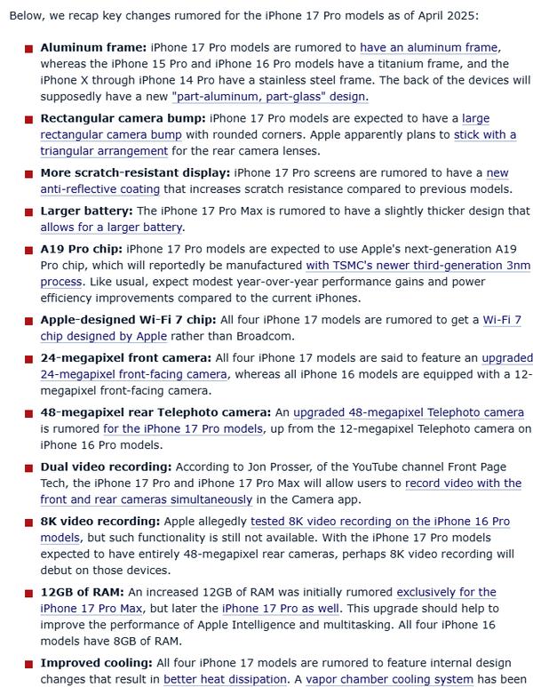 【CNMO 技术新闻】根据苹果新产品的发布节奏,iPhone 17 这个系列很有可能在今年秋天出现。最近,CNMO 注意到,有海外媒体整理出来了。 iPhone 17 Pro 系列 12 项目设备升级。