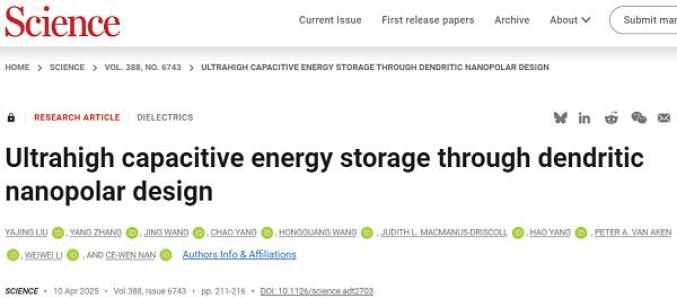 基于上述问题,南京航空航天大学李伟伟教授、杨浩教授、德国马普学院王红光教授、清华大学南策文教授联合在Science上发表了题为“Ultrahigh capacitive energy storage through dendritic nanopolar design”的论文,利用自组装的枝状纳米极化,提出了一种微观结构策略(DNP)结构,并将其引入宽禁带绝缘材料,同时提高了击穿强度和高场极化率,最大限度地减少了能量损失,从而显著提高了储能性能和稳定性。与此同时,DNP结构保持了极化区域的连通性,实现了高电场下大极化率和低剩余极化平衡,降低了能量损耗。与此同时,DNP结构保持了极化区域的连通性,实现了高电场下大极化率和低剩余极化平衡,减少了能量损耗。研究发现,PbZr0.53Ti0.47O3-MgO薄膜基于DNP结构设计在7.4. MV在215.8.8cm的高电场下, J高能密度和80.7%的充放电效率为/cm3。本研究为高性能微型电容器的设计提供了新的途径,也对新型电介质材料的开发起到了重要的指导作用。