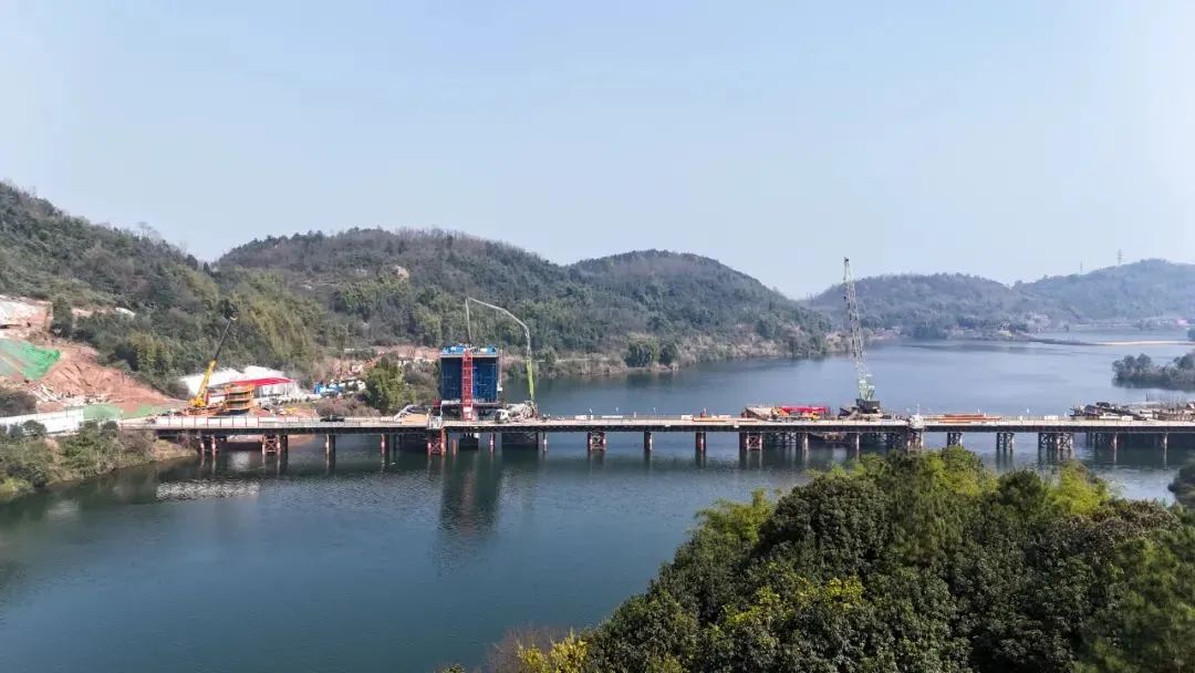 位于重庆市铜梁区玄天湖4A级景区的玄天湖双线大桥,总长460.561米,8墩2台,4墩。、5、6号主墩位于玄天湖,水深最深13米,环保规定高,施工难度大。为了保护天鹅栖息地和湖泊生态,建设者创新应用智能建设技术,将跨湖建设栈桥缩短至最短路径。