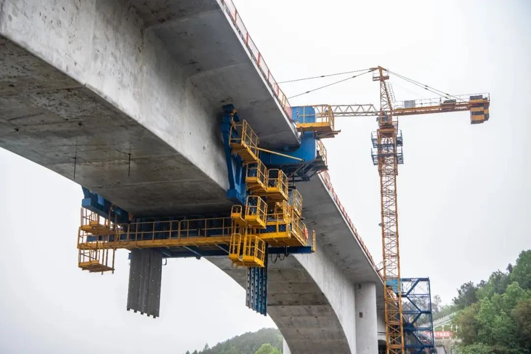 其中,玄天湖双线桥梁连续梁采用中国新一代智能悬臂造桥机施工,比传统工艺降低了50%以上的高空作业风险,提高了15%的施工效率。桥梁施工中,桩基超声检测、墩体智能喷淋维护等工艺得到广泛应用,质量达标率达到100%。