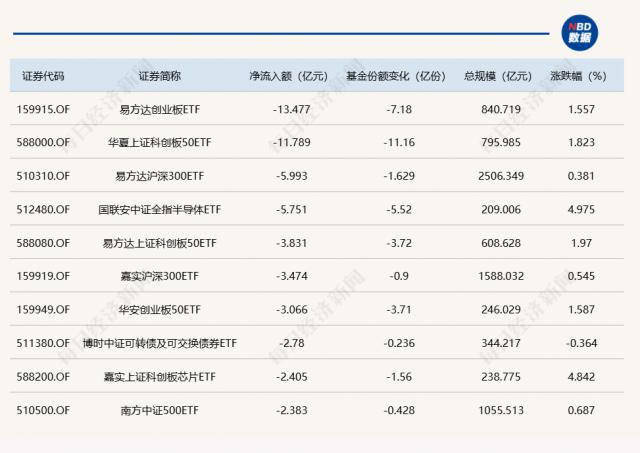 同时,易方达创业板 ETF 减少基金认购 7.18 一一一亿份,净流出额为 13.48 亿元;华夏上证科技创新板 50ETF 份额降低 11.16 一一一亿份,净流出额为 11.79 亿元;沪深易方达 300ETF 份额降低 1.63 一一一亿份,净流出额为 5.99 亿元。