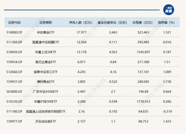 Wind 数据显示,是的 4 月 11 日的非货币 ETF 华安黄金在市场上 ETF 增加了基金认购 2.46 十十亿份,净流入额为 17.98 亿元;海富通中证短融 ETF 份额增加 0.11 十十亿份,净流入额为 12.36 亿元;华夏上证 50ETF 份额增加 4.56 亿份,净流入额为 12.18 亿元。