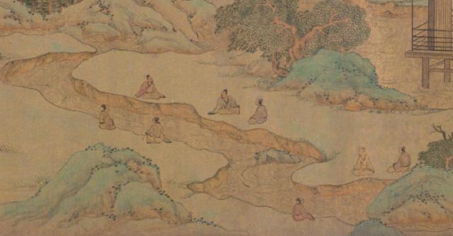 即便如此,必要的仪式崇拜还是不可或缺的,但集体沐浴并不是很优雅。文人只是用小溪洗手洗脚,稍微湿了一下裙子,以此来展示和清除污秽。一些学者还拿了一些鸡蛋和大枣扔进水里,以获得好的颜色。王羲之作为聚会的主人,是观众关注的焦点,待得其施礼结束后,其他客人纷纷在溪边找到自己的位置。大家面对的溪流是兰亭江西长山坝兰亭桥下游 200 米段,这条小溪位于今浙江绍兴兰亭景区西部, 20 世纪 70 在时代末日的截弯改造之前,它是一个“字形”,流水宽阔而缓慢,可以坐在两岸。而且这个地区的山脚生产竹子,有“茂林修竹”的景象。