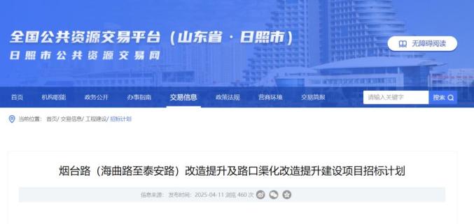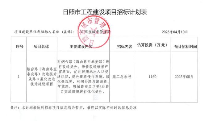 主要建设内容:烟台路(海曲路至泰安路)改造升级, 对损坏严重的路面进行维修改造, 提升日照站进出口交通组织,提升路面慢行系统和绿化景观,优化升级烟台路与滨州路、学苑路、聊城路交叉口等三个交通组织。