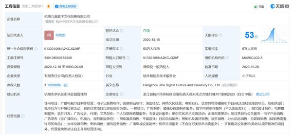 天眼查显示,何世杰是杭州何同学文化传媒有限公司的法定代表人和股东,其最新名称是“杭州数盒数字文化创意有限公司”,成立于 2020 年 12 月份,注册资本 50 万元,经营范围包括网络文化经营、数字内容制作服务、个人网络直播服务等。