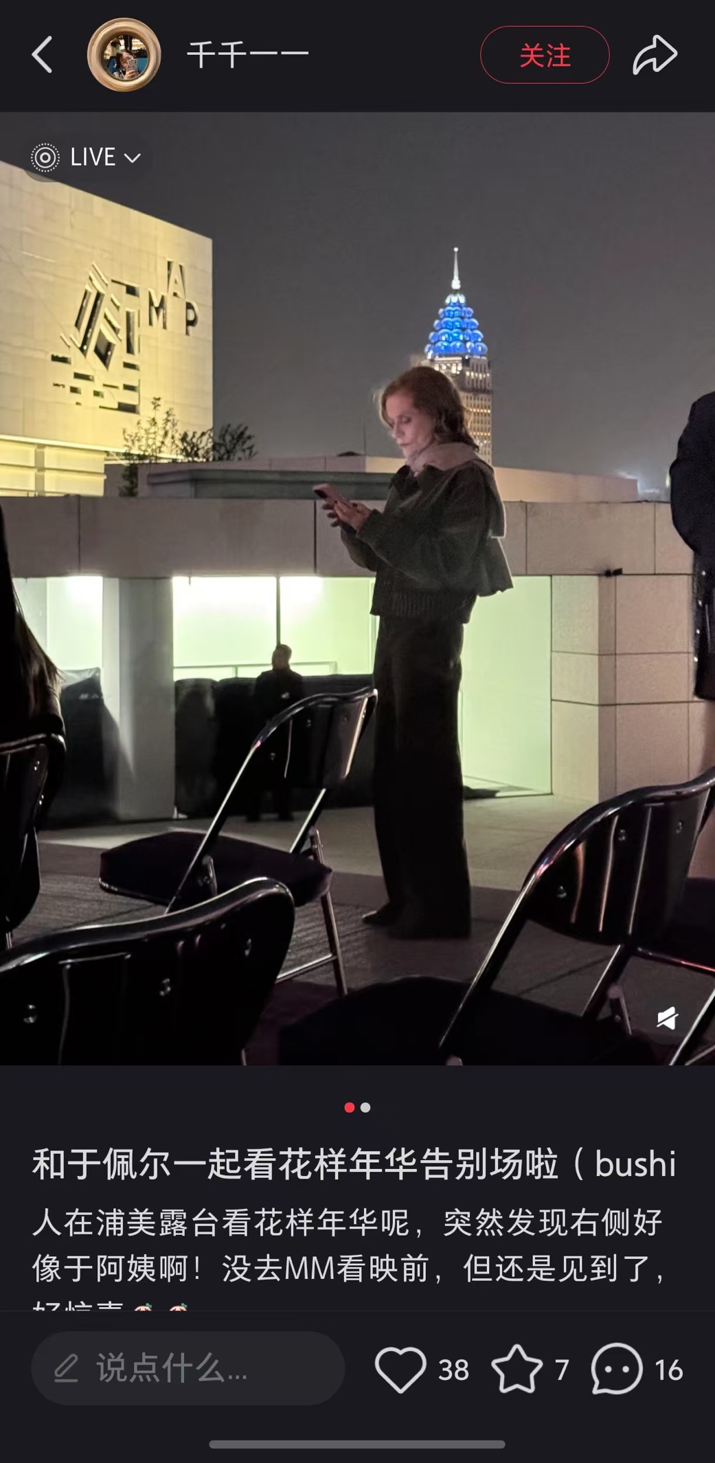 值得一提的是,告别当晚,很多粉丝在现场捕捉到了法国电影明星伊丽莎白·于佩尔。原来,于佩尔也是王家卫的铁杆粉丝。她没有敲定行程,在电影放映结束时来到浦东美术馆的放映现场,“打卡”了光影活动。然而,现场工作人员表示,这是于佩尔的私人行程,所以他们没有与观众进行更多的互动。