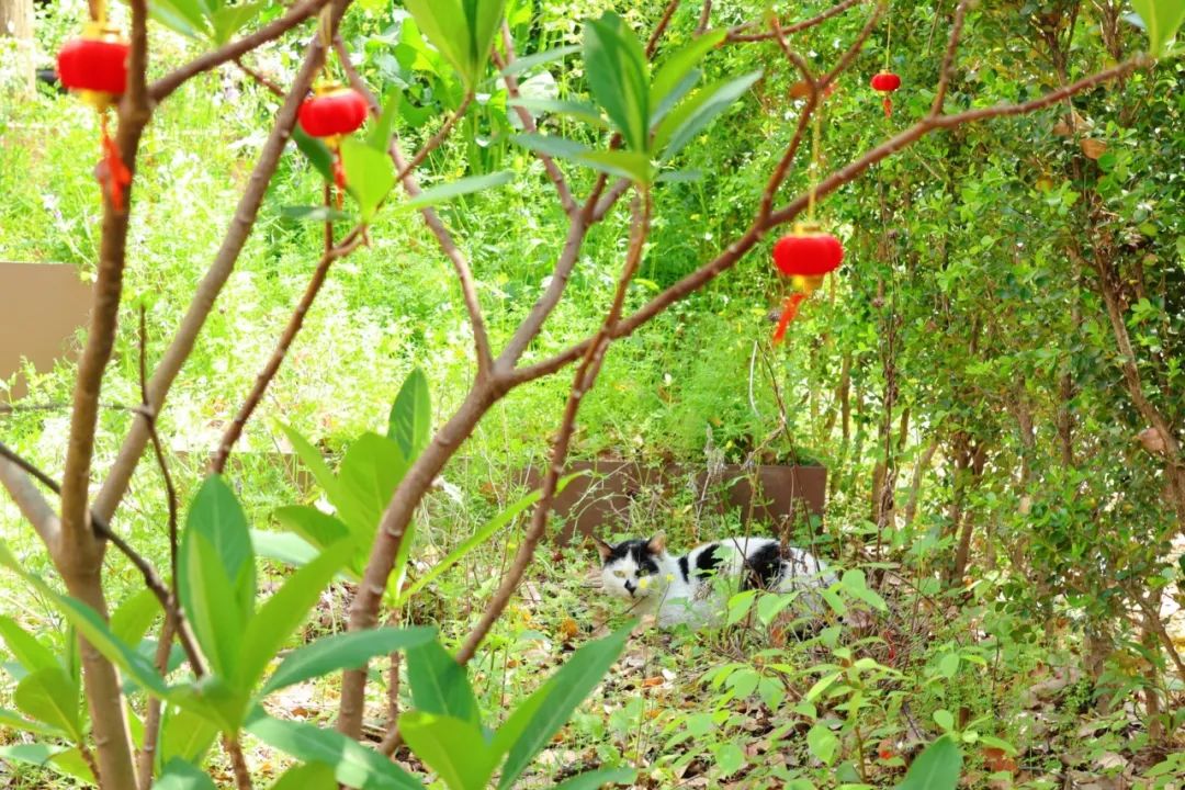 “宁宁”看到花园里生长着结香、榆树等各种植物,同时点缀着几个小红灯笼,为这个精致而有趣的世界增添了不少欢乐。