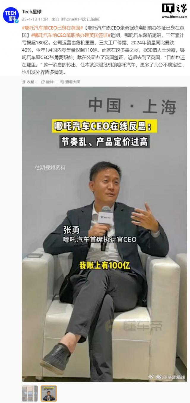 另据 Tech 星球 4 月 13 日报道,哪吒汽车原 CEO 据报道,张勇在辞职前已经在英国办过签证。。报道称,哪吒汽车深陷泥潭,三年累计亏损超过。 180 亿。企业经营也处于危机之中,三大工厂暂停,2024 年销售额同比大幅下降 40%,今年 1 每月国内零售额仅剩 110 辆。可是在这个多事之秋,据知情人士透露,哪吒汽车原来 CEO 在张勇辞职之前,他在公司申请了英国签证,最近去了英国,“现在还在。“这个消息的传出,让已经陷入危机的哪吒汽车,更加不确定,也引发了许多外界的猜测。