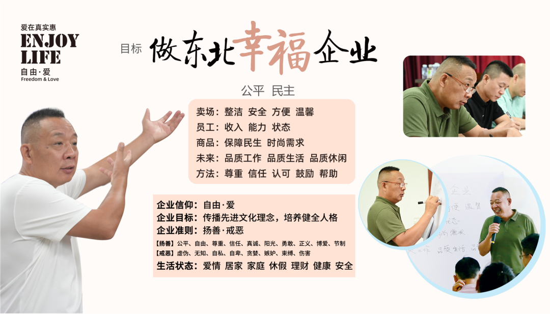 当我们懂得“放下利润,先成就团队”时,当我们真正把年度利润作为员工工资调整投资时,公司一线基层员工月平均工资扣除4500元以上(大石桥店4200元,营口店4500元,鲭鱼圈优秀店5200元),当员工执行日工作6、每年累计休假时间超过7小时并享受130天,当我们为员工提供50多项免费福利和休闲、娱乐和锻炼的家园时,我们正在努力实现与员工的共同繁荣。