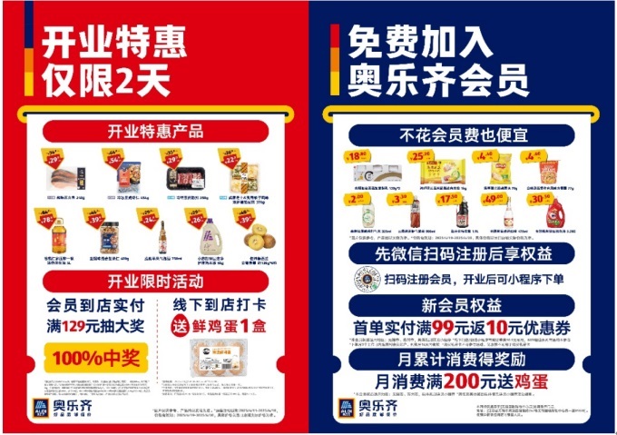 开业期间,苏锡客户不仅可以购买9.9元网红爆款,还可以设计免费领取鸡蛋,新会员首次付款99元后返还10元优惠券等活动。;此外,4月19日至4月20日营业期间,线下门店每次购物实际支付129元,即可获得抽奖机会,100%中奖。因此,奥乐齐期待吸引更多的当地居民。