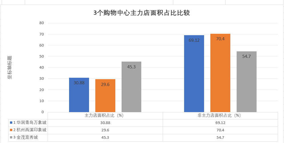 在三个具有可比性的购物中心中,总结出主店面积的比例,得到以下图表: