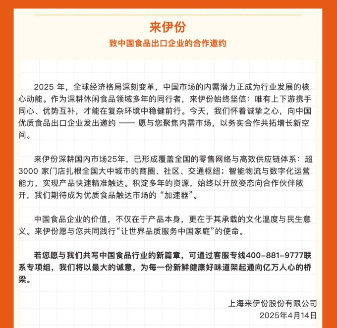 来伊份表示,凭借多年积累的资源,来伊份始终以开放的态度向合作伙伴敞开心扉,期待成为高品质食品到达市场的“加速器”。中国食品企业的价值不仅在于产品本身,还在于其承载的文化温度和民生意义。来伊份愿与其共同践行“让世界品质为中国家庭服务”的使命。