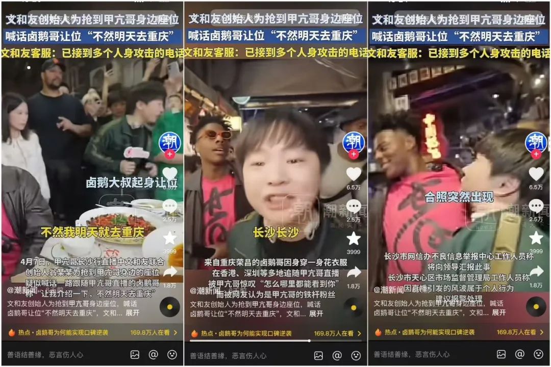 另外,甲亢哥的最后一站——长沙,由于日程安排不当,“表演意味”颇重,备受争议。更重要的是,在甲亢哥游长沙的那天,他去长沙文和友吃饭,这本来是文和友宣传的好时机。然而,在宴会上,文和友的创始人东华可能太焦虑了。为了坐在甲亢哥旁边,他对坐在他旁边的红烧鹅哥说:“I am boss,I am boss!同时,我也在做餐饮,请互相理解,你可以起床,我要介绍一下,否则我明天就去重庆。”这一命令式的态度和语气引起了网友的不满。