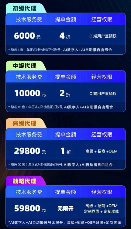 高级代理的加盟费是29800元,战略代理的加盟费是59800元。这两个代理级别最大的优势就是可以免费获得代工服务,后期开通数字账号或者复制都是按照零售价的10%计算的。服务提供商表示,有了免费代工服务,代理商可以打造自己的数字直播平台,定价由自己决定,利润更高。