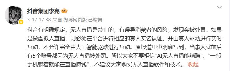 据悉,3月17日,抖音集团李亮提到抖音明确规定,禁止无人直播,存在误导消费者的风险,发现将被处理。假如是做虚拟直播,则必须在平台上进行相应的真实实名认证,并由真实人员驱动进行实时互动,不能全部由人工智能驱动进行互动。