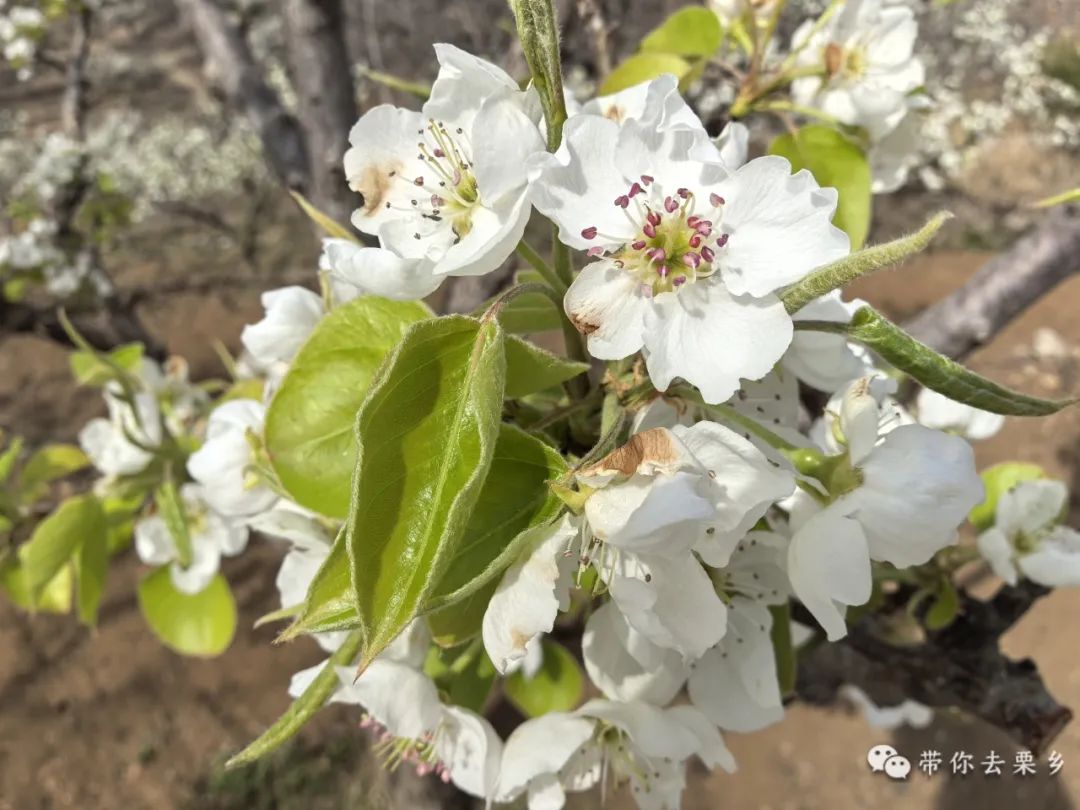 远远望去,整个梨园就像覆盖着新雪,层层明亮的白色沿着地形倾泻而下。风过的时候,树枝颤抖的花瓣变成了流动的云浪。近看,五瓣梨花如玉般闪闪发光,花芯之间的一点点嫣红就像美人脸颊上不均匀的胭脂,优雅中带着一丝羞涩。