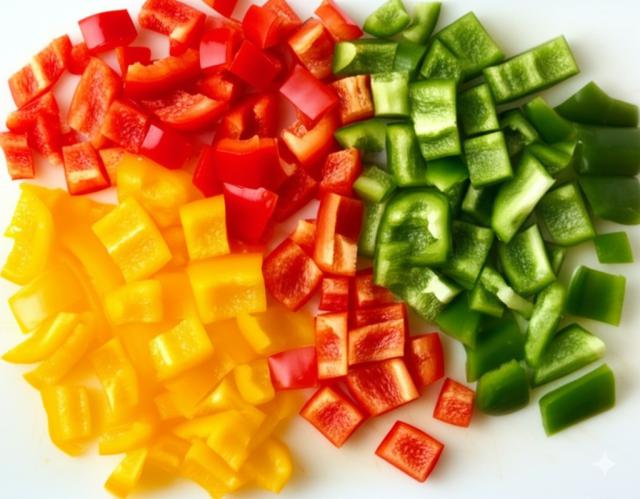 将红椒、黄椒和青椒(如用)去籽后切成大小均匀的小块。