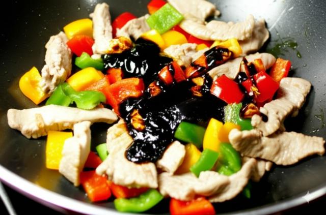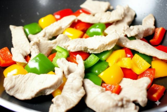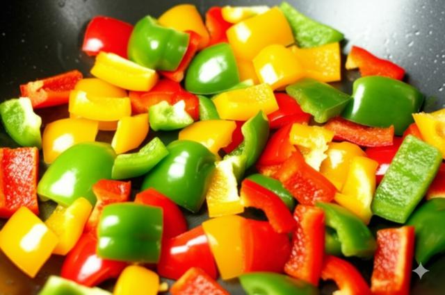 加入切好的彩椒块和青椒块(如果使用),翻炒至彩椒断生,约为 1-2 分钟。