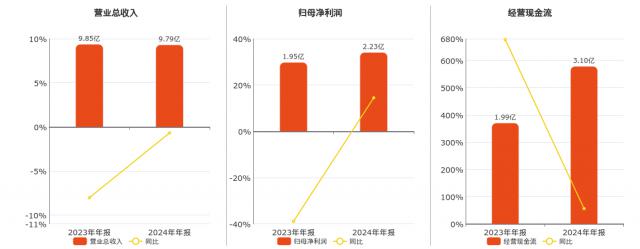 企业总营业收入为 9.79 与去年同期报告期营业总收入相比,亿元减少 674.55 与去年同期相比,万元有所下降。 0.68%的归母净利润 2.23 十亿元。经营活动现金净流入 3.10 亿元。