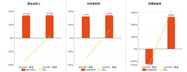 企业总营业收入为 14.90 亿元。归母净利润为 2.50 十亿元。经营活动现金净流入 2.86 亿元。