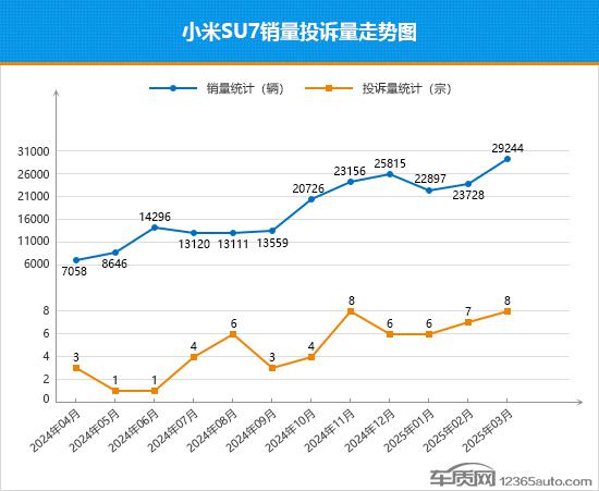 小米作为第一款全新品牌的车型, SU7 从 2024 一年一路“火”到了 2025 年份,特别是在它 2 月推出小米 SU7 Ultra 此后,市场声量一时无两,大步走进高档纯电车队伍。从其近一年的销售投诉量走势可以看出,整体呈上升趋势,自 2024 从第四季度开始,已经连续开始。 6 月度销售突破 2 万台。3 月,小米 SU7 销量直追 3 万台价格,环比上涨 23.3%,创造了车型月销历史的最高纪录。根据不完全统计,小米汽车的累计交付量已经超过 20 万台,锁单量超过 42 万台。反观小米 SU7 月度投诉的表现,同样有目共睹。随着销售额的快速发展,其月投诉数量始终保持在个位,短期口碑表现值得肯定。从 3 每月投诉销售比值的变化, 2 月份保持一致,表现保持稳定。就目前小米 SU7 就市场走势而言,上升势头强劲,突破 3 一万个价格指日可待!