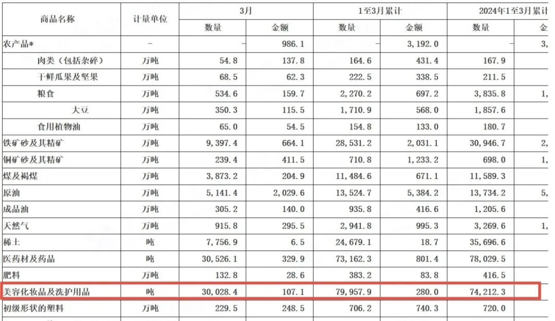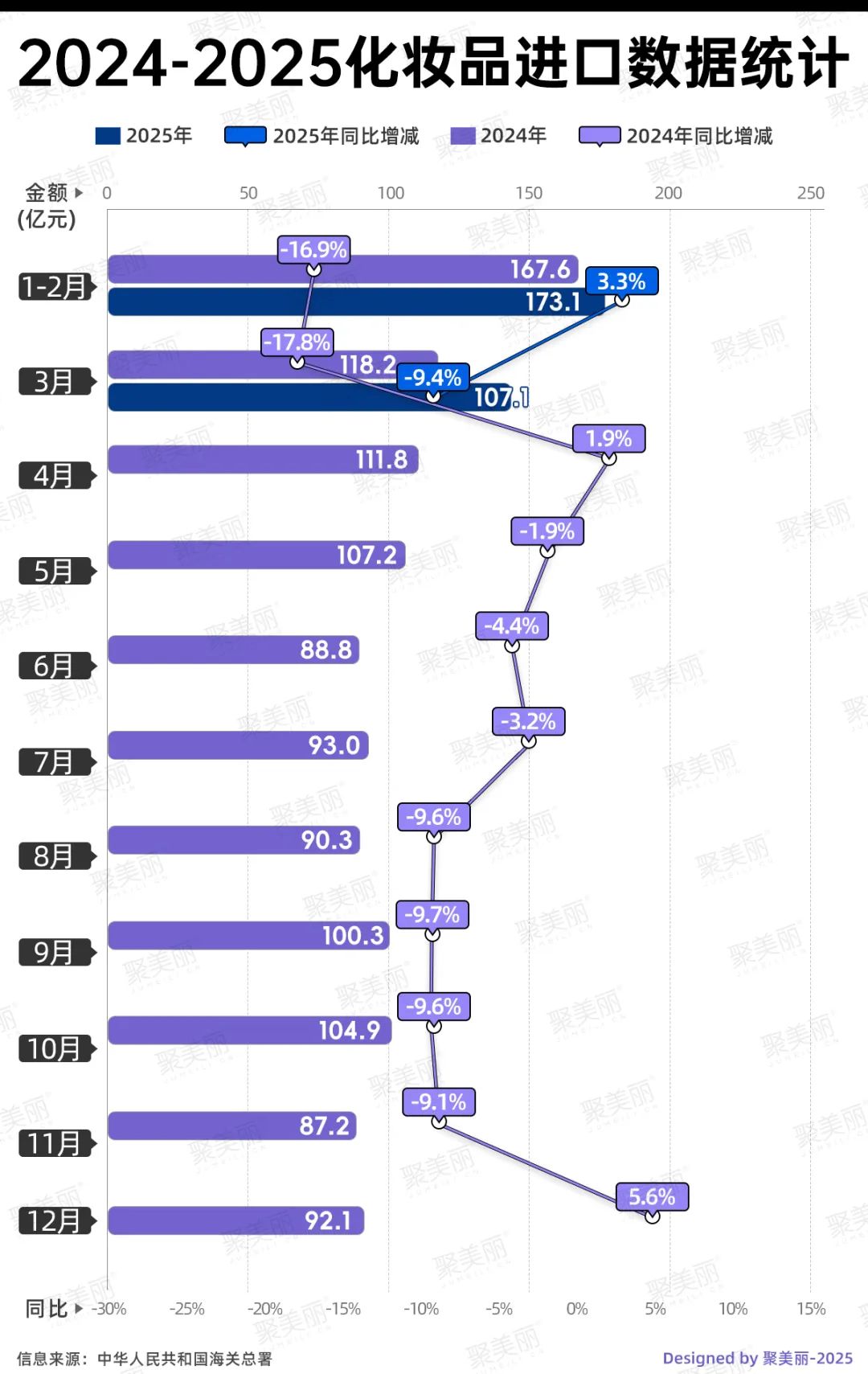 聚焦进口美容数据,今年1-2月经历了短暂的春天,但今天(4月14日),国家海关总署发布了2025年3月全国进出口的主要数据:其中,3月份进口的美容化妆品和洗漱用品(以下简称化妆品)为3万吨,比去年同期减少了1.6%。;进口量为107.1亿元,比上年同期下降9.4%。