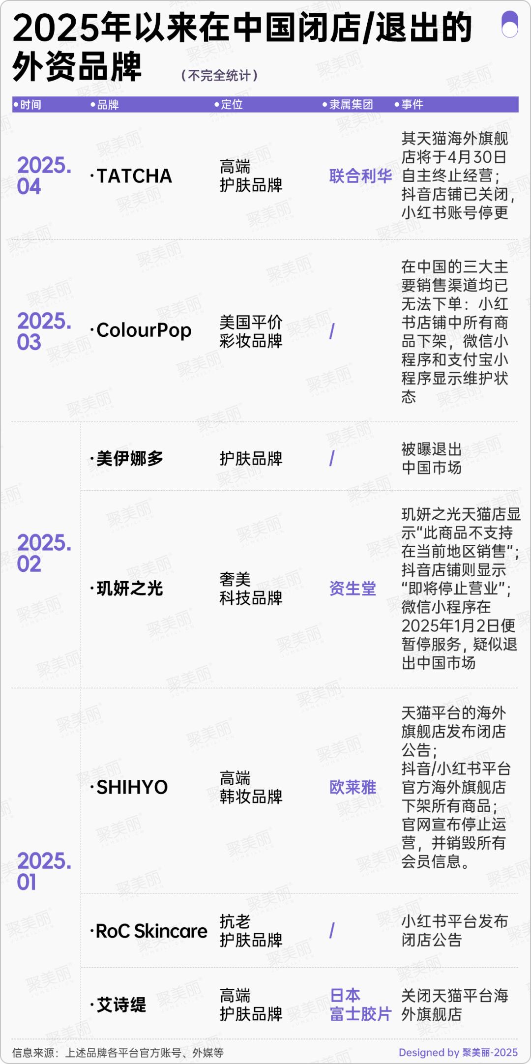 此外,外资美容品牌在中国市场的“败退”仍在上演。据聚美丽不完全统计,仅2025年以来,中国就有7个外资品牌关闭并退出。