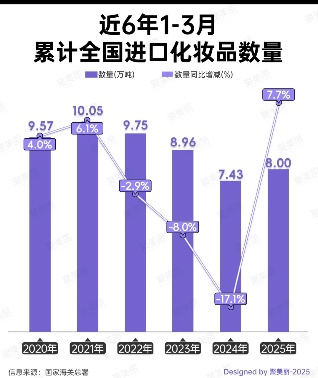 进口化妆品数量的季度表现有些不同。2025年第一季度呈下降趋势,自2022年以来经历了许多起伏。2022年,2024年、2025年1-3月进口化妆品均有所下降,2024年1-3月均跌破双位数。