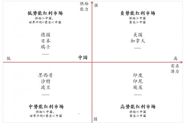 在鲲鹏出海的数据研究中心,团队通过供应能力(生产工艺),以中国为基础。 / 规模成本)和需求容量(消费潜力 / 市场饱和度)将全球市场分为四大战略象限(高、中、低负势能红利市场)。这种模式也被团队称为“供需势能差模式”。