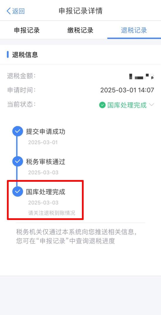 “国库处理完成”表示退税成功,请注意退税是否已退入您提交退税申请时选择的银行卡账户。